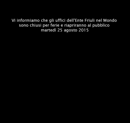 Vi informiamo che gli uffici dell'Ente Friuli nel Mondo saranno chiusi da giovedì 24 dicembre a mercoledì 6 gennaio 2016. Buon Natale e Felice 2016 a tutti!