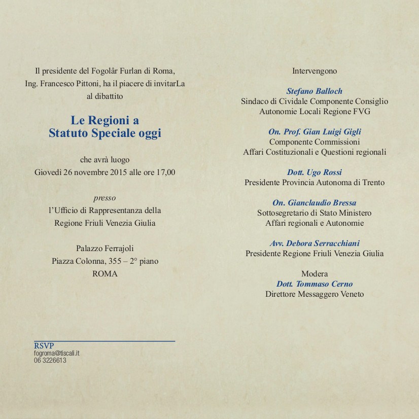 Le Regioni a Statuto Speciale oggi (Roma – Ufficio di Rappresentanza della Regione FVG, giovedì 26 novembre ore 17.00)