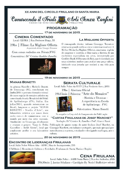 20° Anniversario del Circolo Friulano di Santa Maria Conoscendo il Friuli - Arti senza Confini (Santa Maria - RS Brasile, 17 – 20 novembre)