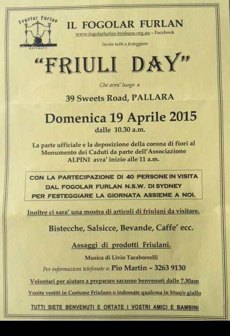 Friuli Day al Fogolar di Brisabane - Domenica 19 aprile