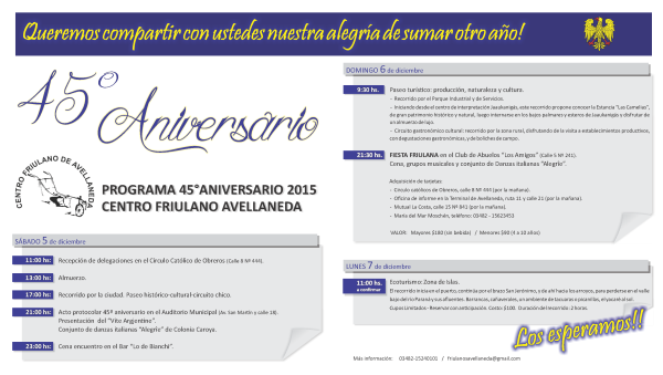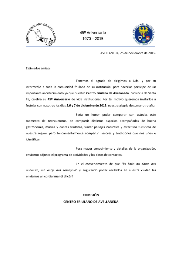 45°Anniversario del Centro Friulano di Avellaneda de Santa Fe – Argentina (5 – 7 dicembre)