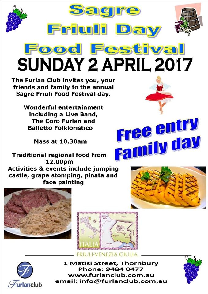 Sagre Friuli Day Food Festival (Fogolâr Furlan Melbourne - 2 aprile, h 10.30)