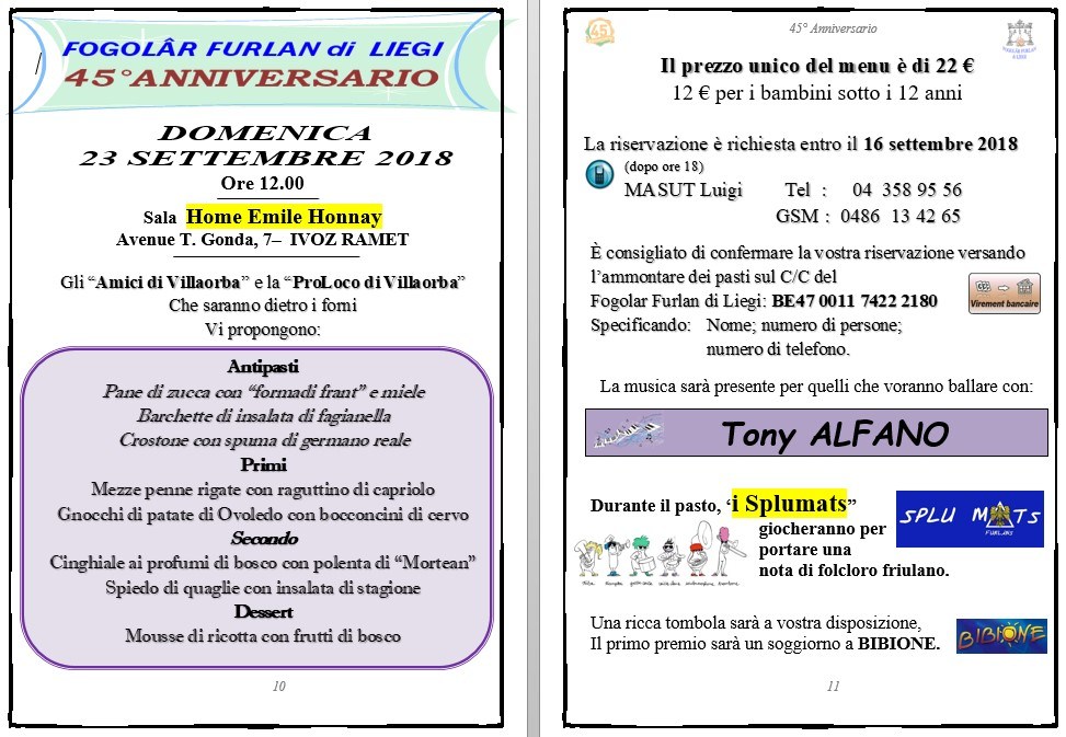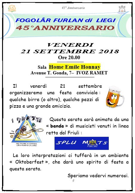 45° anniversario Fogolâr Furlan di Liegi (venerdì 21 settembre ore 20.00 e domenica 23 settembre ore 12.00 – Sala Home Emilie Honnay – Avenue T. Gonda, 7, IVOZ RAMET)