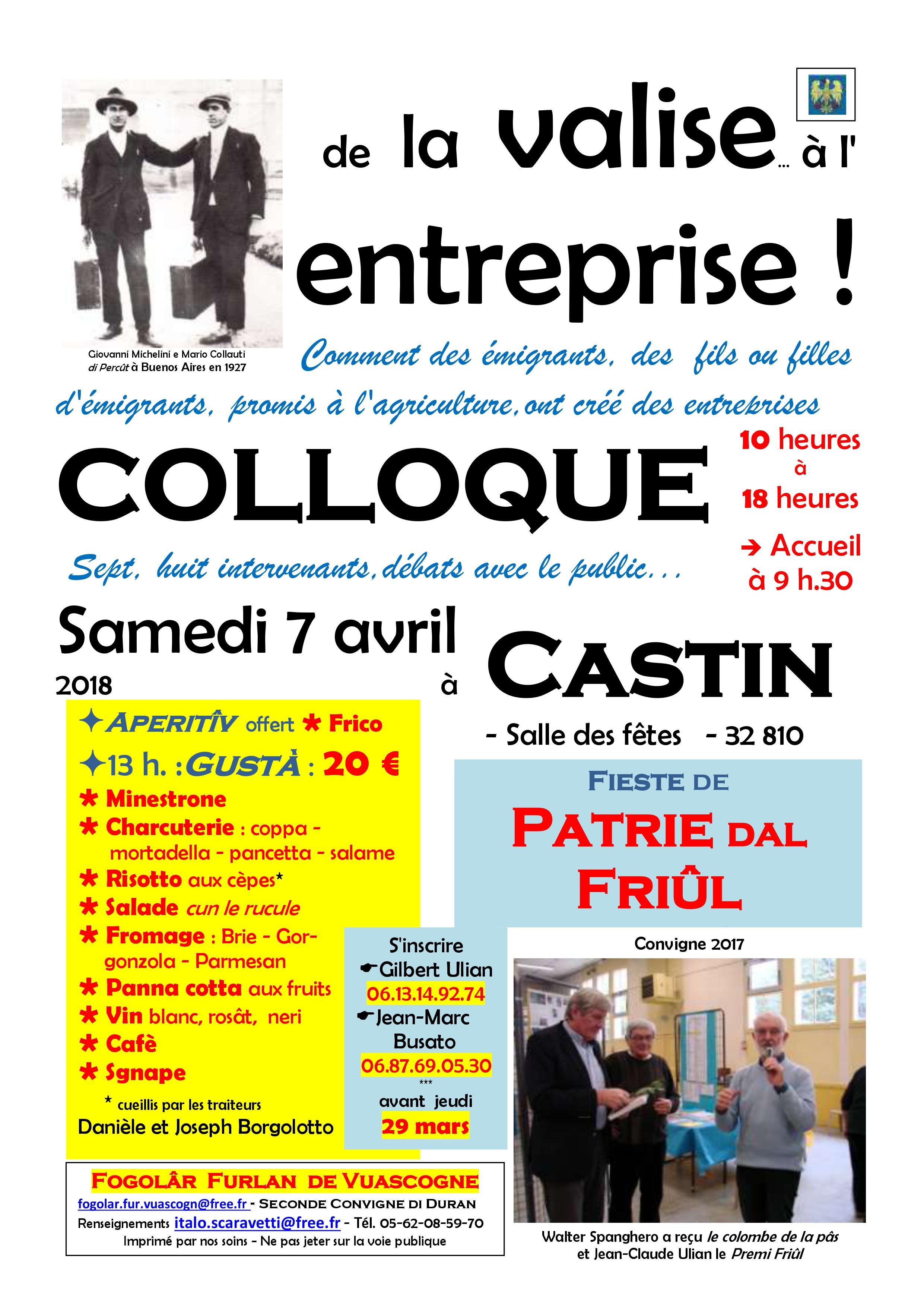 Convegno "De la valise à l'entreprise!" (Fogolâr Furlan de Vuascogne - Castin (Francia), sabato 7 aprile - Salle des fêtes - dalle 10 alle 18)