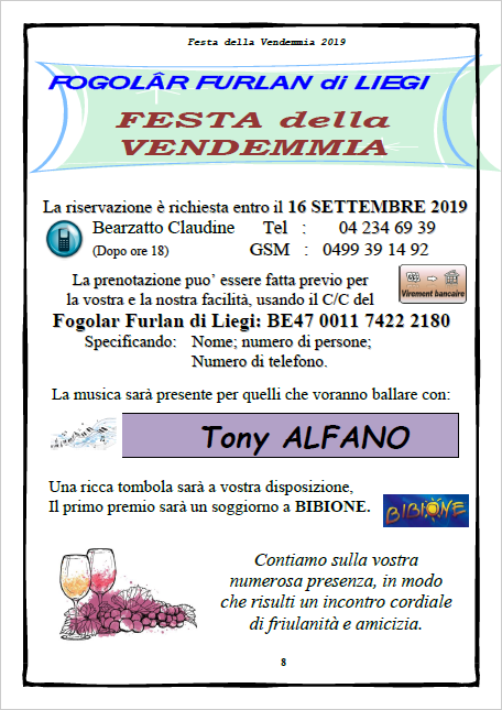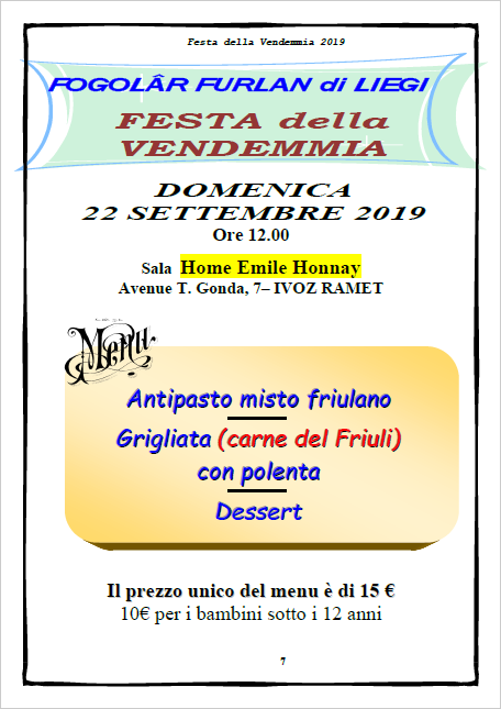 Festa della Vendemmia (Fogolâr Furlan di Liegi, domenica 22 settembre, ore 12.00 - Sala Home Emilie Honnay, Ivoz-Ramet)
