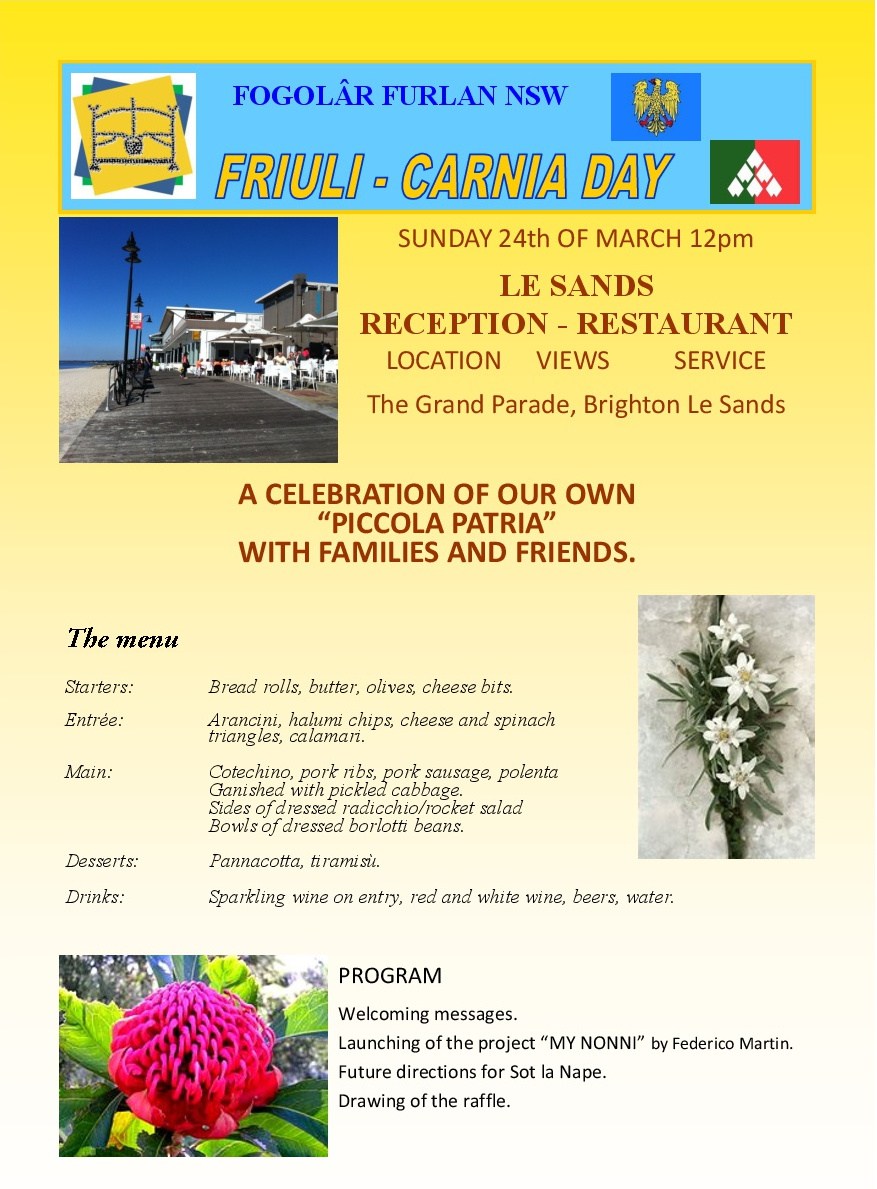 Friuli - Carnia Day 2019 (Fogolâr Furlan New South Wales - Australia - domenica 24 marzo, ore 12.00 - "Les Sands Reception - Restaurant", the Grand Parade, Brighton Le Sands)