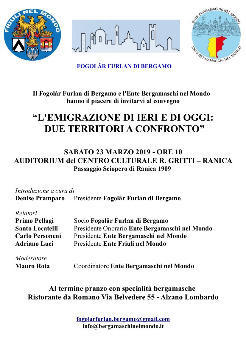 L'emigrazione di ieri e di oggi: due territori a confronto (Fogolâr Furlan di Bergamo, sabato 23 marzo, ore 10 - Auditorium del Centro Culturale R. Gritti - Ranica)