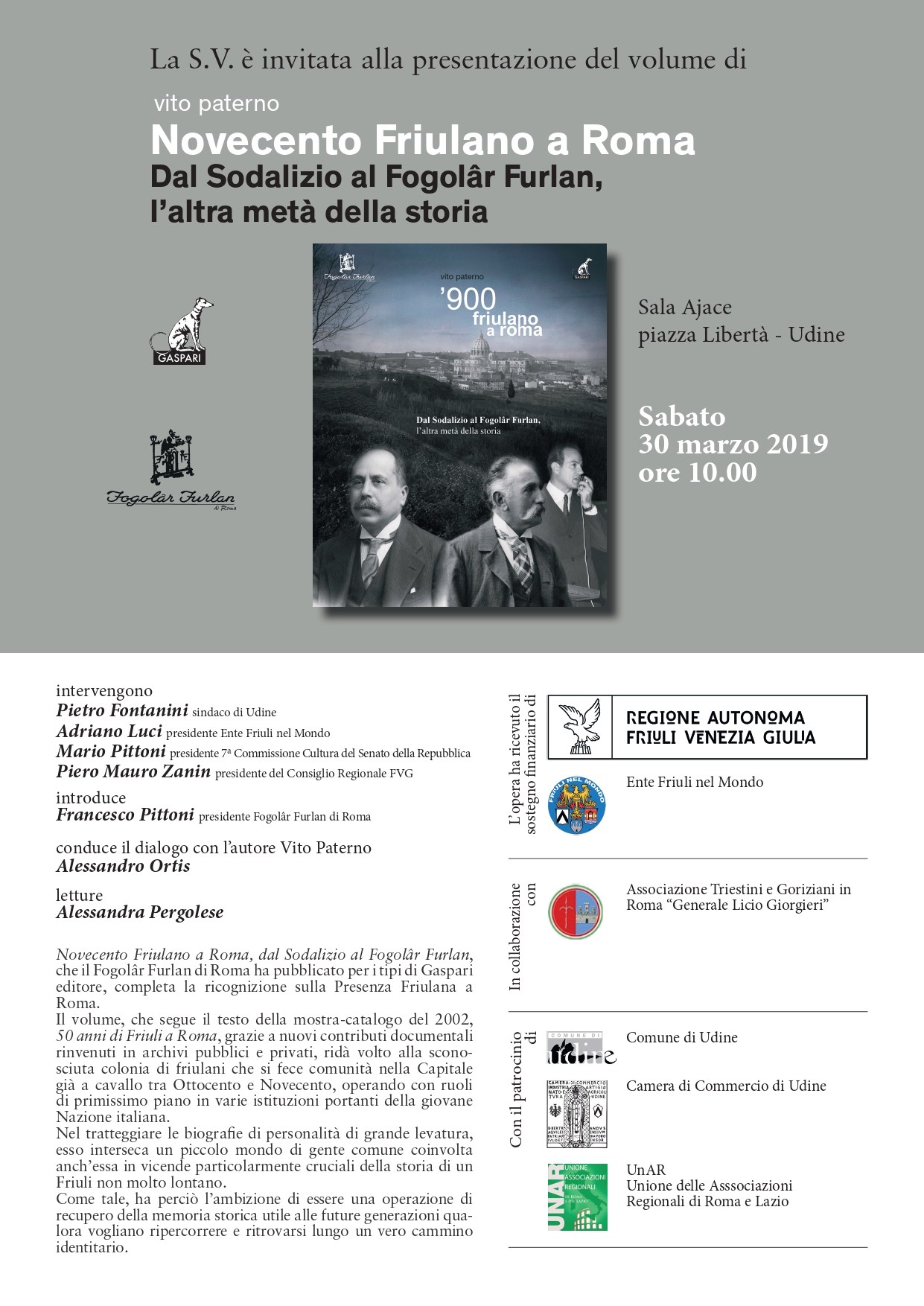 Presentazione del libro "Novecento Friulano a Roma (Fogolâr Furlan di Roma, sabato 30 marzo 2019, ore 10.00 - Sala Ajace, piazza Libertà - Udine)