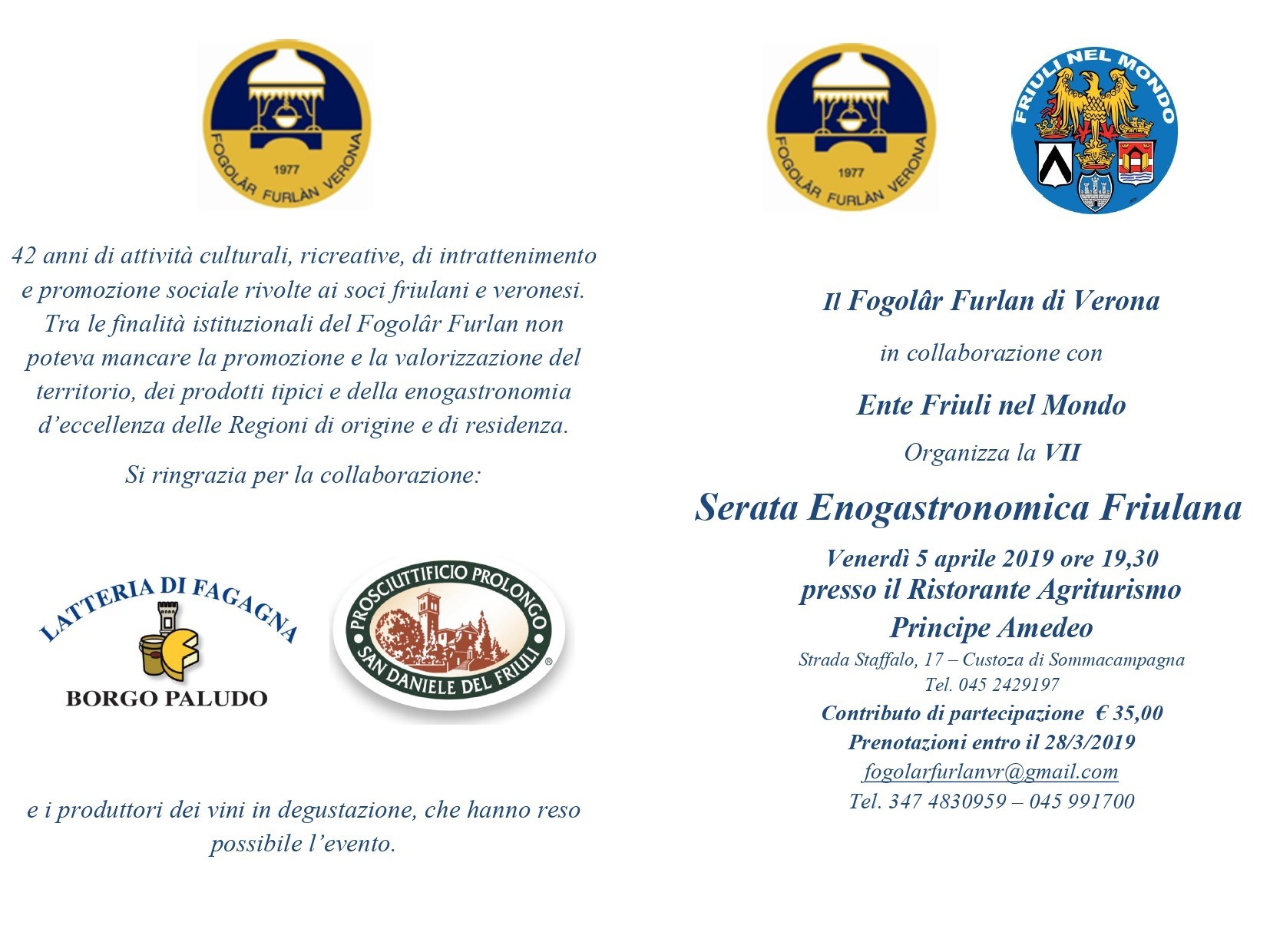 Serata Enogastronomica Friulana (Fogolâr Furlan di Verona, venerdì 5 aprile 2019, ore 19.30)