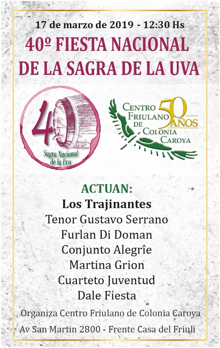 40^ Fiesta Nacional de la Sagra de la Uva (Centro Friulano de Colonia Caroya - domenica 17 marzo, ore 12.30 - Av San Martin 2800, Colonia Caroya - Cordoba, Argentina)