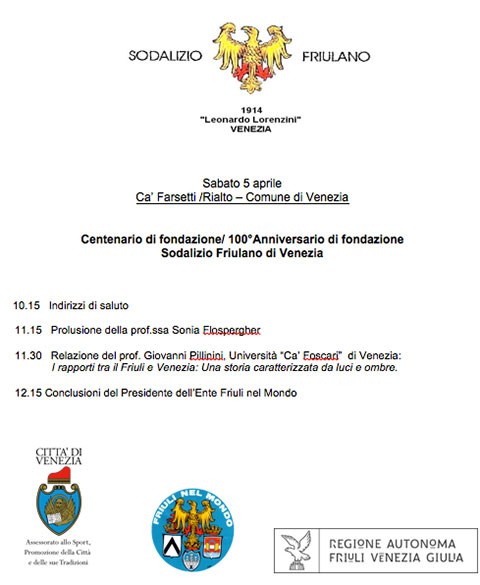 100° anniversario del Sodalizio Friulano di Venezia - Sabato 5 aprile a Rialto – Venezia